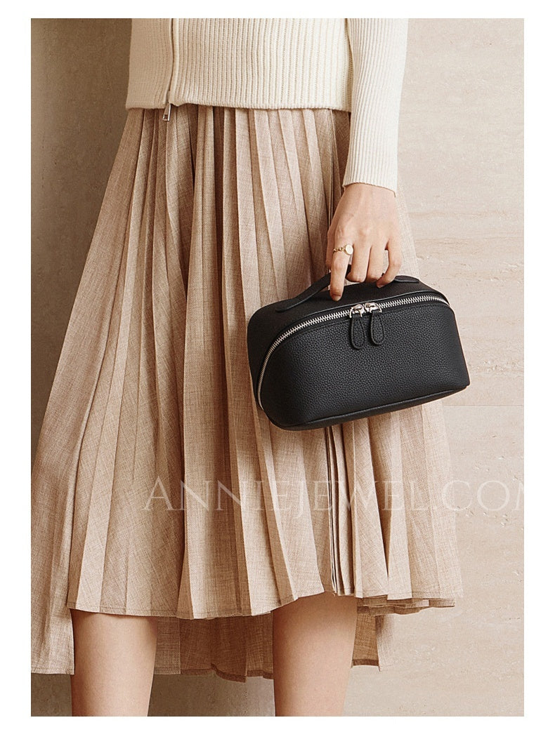 Genuine Leather Makeup Bag With Compartments Black Leather Cosmetic Bag For Women