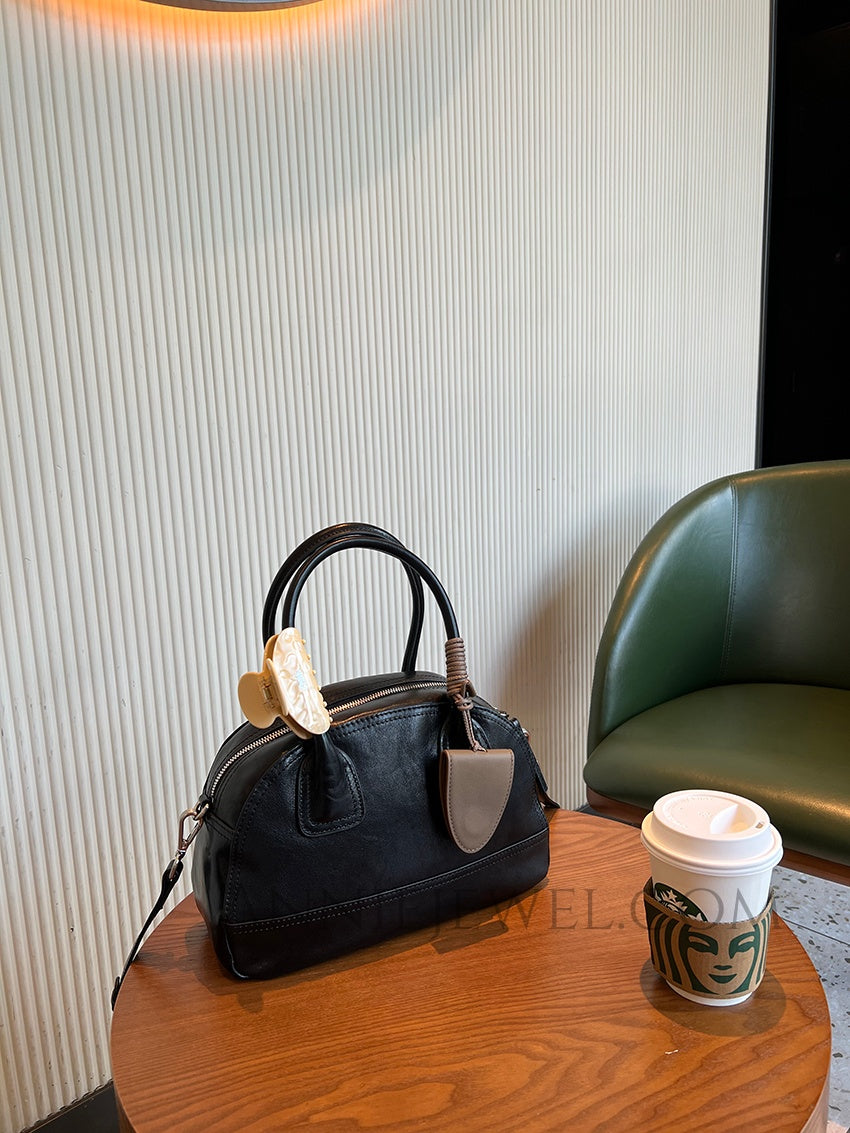 Small Black Leather Boston Bag Genuine Leather Boston Bag Handbag Womens