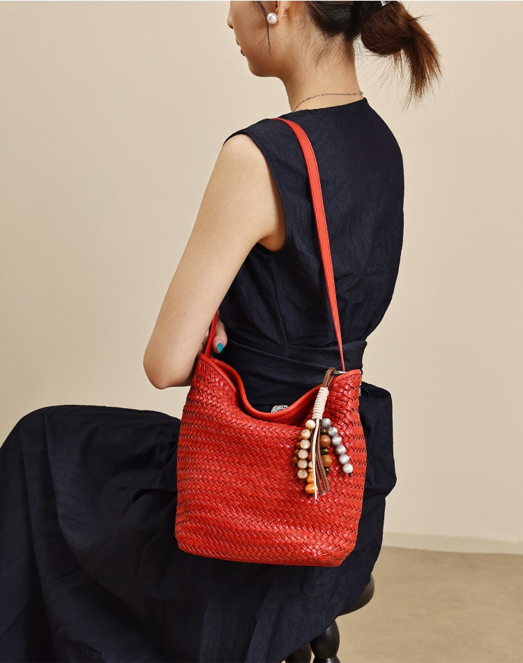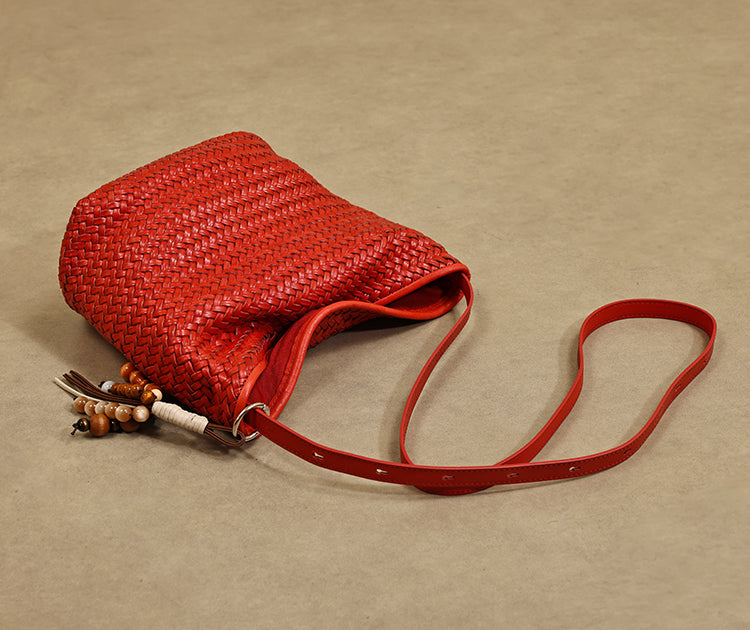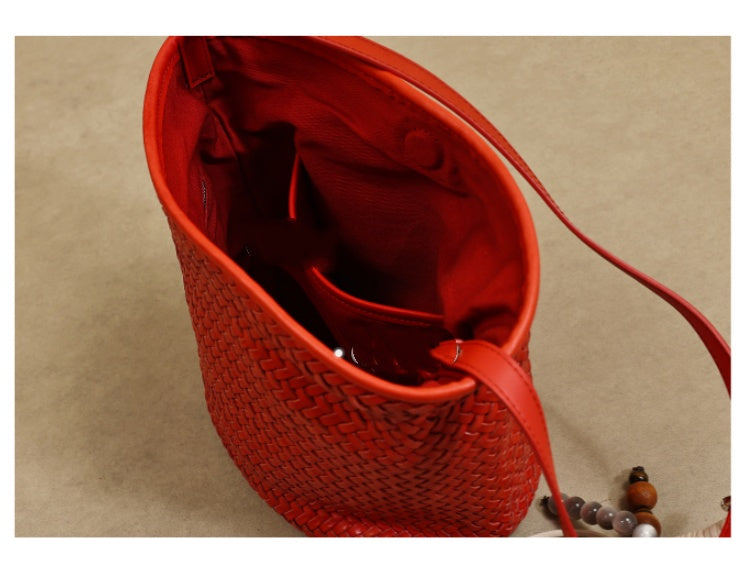 - Design: Red Woven Leather Bucket Bag Shoulder Bag Genuine Leather Woven Bag Womens
