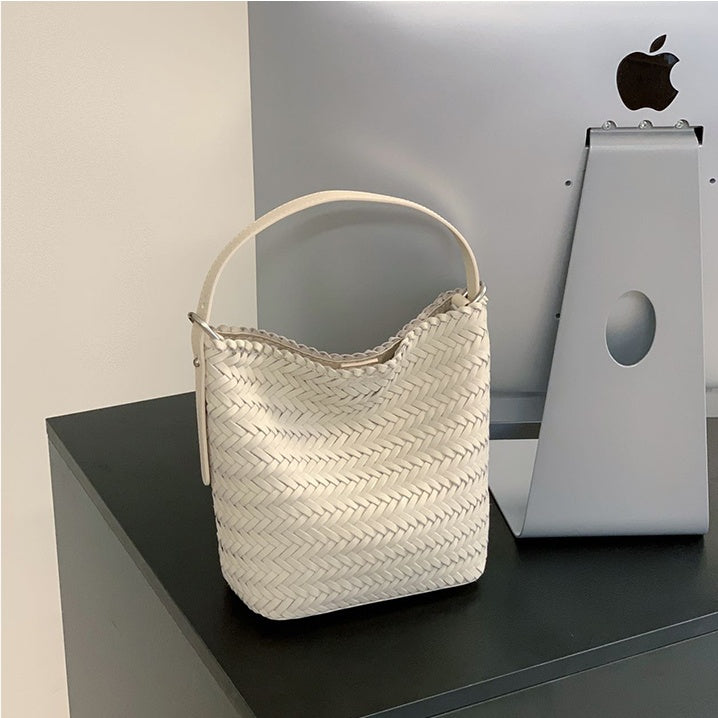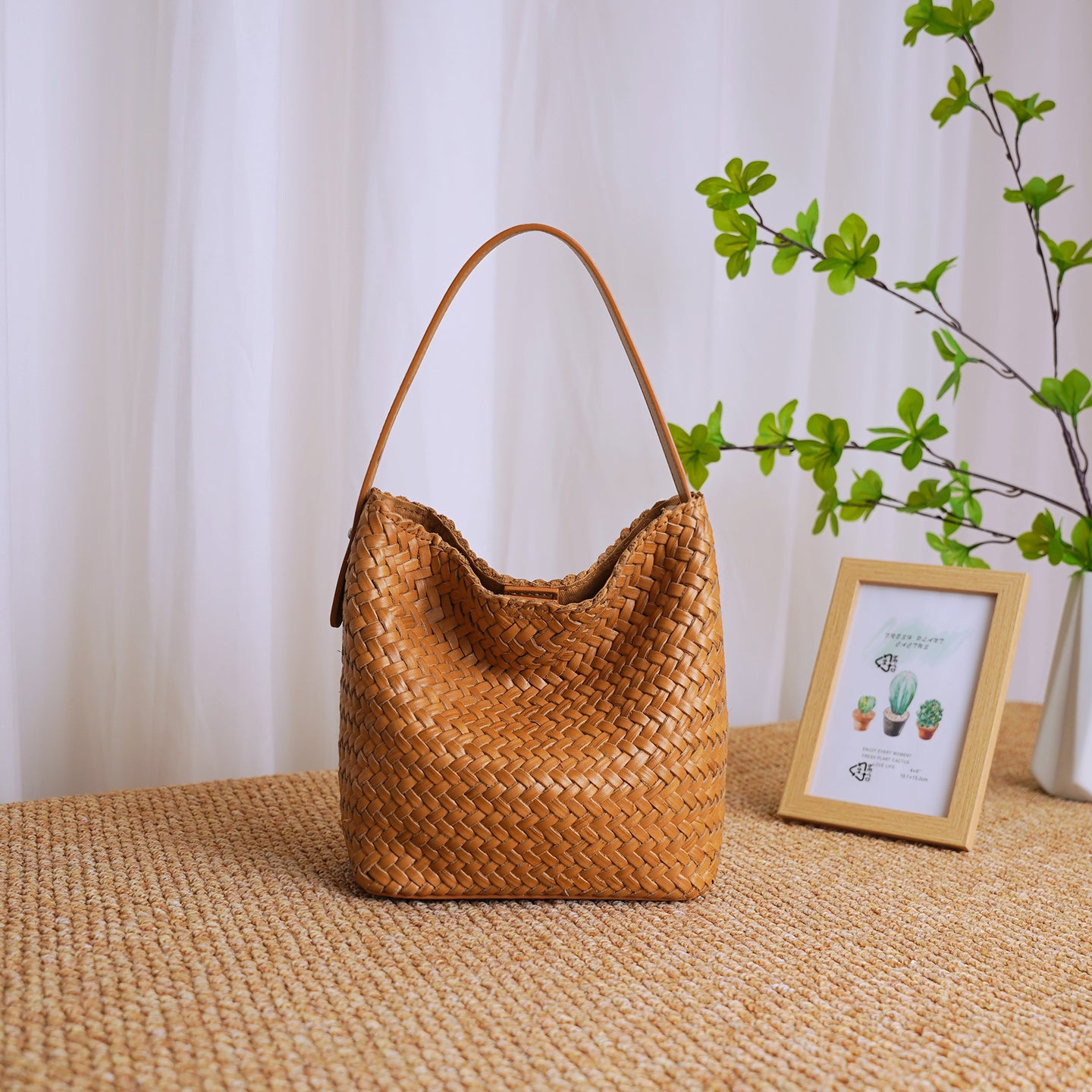 Small Woven Leather Bucket Bag Genuine Leather Bucket Shoulder Bag Womens