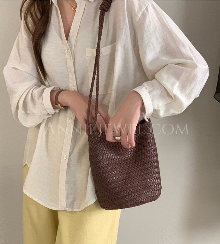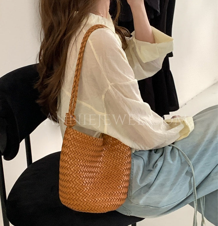 Black Woven Leather Bucket Bag Genuine Leather Bucket Shoulder Bag Womens